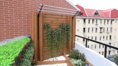 屋頂改造示意圖 為了確保屋頂?shù)姆浪⒈睾透魺幔┕り犑紫仍诹荷霞恿舜印⑸w上了木板,澆筑了瀝青,鋪設了瓦片。然后,又在屋頂室內(nèi)的部分,加塞了填充物。 PART2:軟裝及空間布置部分 1、 陽臺-晾曬不再危機四伏 功能無限增大