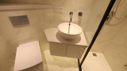 改造后多多功能區(qū)域 改造后的多功能室,采用了白色主體和小面積橙色的點綴。橙色的跳躍感,打破了白色的寂靜,讓整個多功能室充滿生活情趣。還兼具了客臥的功能。 5、衛(wèi)生間-整潔干凈 功能增大