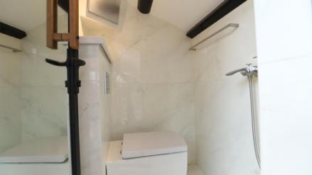 改造后閣樓衛(wèi)生間 衛(wèi)生間位于進門口,2.5平米衛(wèi)浴間滿足了基本生活設施需求。衛(wèi)生間被清晰地分成了廁所和淋浴的區(qū)域,做到了小空間里的干濕分離。 同時,為了提供更好的方便,在閣樓上方設計師也在有效空間內(nèi),為女兒的臥室添置了一個衛(wèi)生間。 5、客廳區(qū)域-客廳、餐廳隨心變