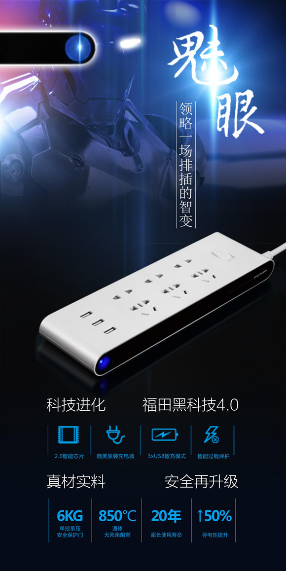 今天小編為各位消費者介紹一款叫福田魅眼USB排插,這是一款搭配USB充電口的排插。一款好的排插可以從多方面去看,最主要還是看產品各個細節部分,小編堅信一個好產品一定是非常注重細節的,在產品工藝、質量上精益求精。