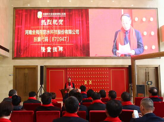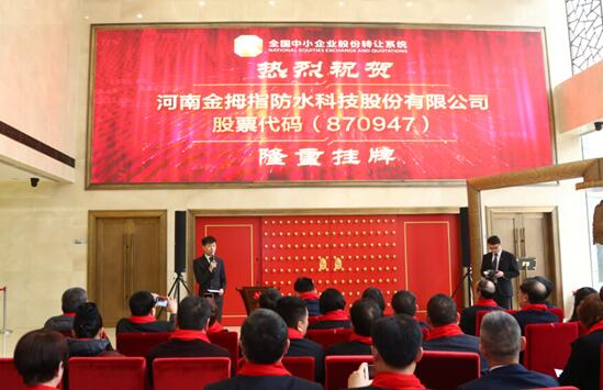 河南金拇指防水科技股份有限公司在2017年2月23日正式掛牌,并于2017年3月17日上午9時30分在全國中小企業股份轉讓系統成功舉辦了“新三板”掛牌敲鐘儀式,股票代碼:870947。