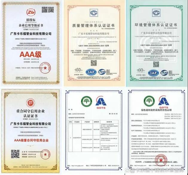 截止目前,憑借著產品與服務優勢,卡樂福已經取得了《招投標信用AAA企業》、《重合同守信用企業認證證書》、《綠色建材政府采購符合性證明證書》、《售后服務體系完善程度認證證書》等工程資質,這意味著卡樂福的產品質量、服務水平和信譽程度均得到了社會的認可。