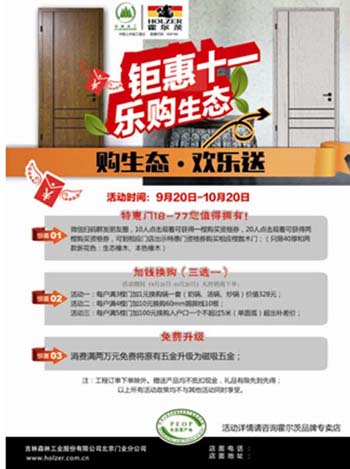 三大驚喜火爆來(lái)襲,為您的國(guó)慶長(zhǎng)假增添色彩,面對(duì)如此的優(yōu)惠狂歡是不是已經(jīng)開(kāi)始按捺不住購(gòu)物的洪荒之力了?別急,事實(shí)上還不止如此,當(dāng)?shù)亟?jīng)銷(xiāo)商更有眾多神秘活動(dòng)與三大驚喜一起助力霍爾茨木門(mén)十一“鉅惠十一 樂(lè)購(gòu)生態(tài)”優(yōu)惠升級(jí),多重優(yōu)惠、各種鉅惠福利為小伙伴們點(diǎn)燃國(guó)慶激情,趕緊趕緊挽起袖子來(lái)霍爾茨瘋狂shopping一番吧!