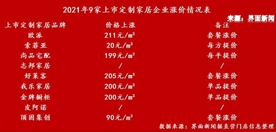 頭部知名企業也紛紛被爆出“小動作”。有媒體根據各品牌直營門店信息整理發現,多家上市定制家居企業以不同的方式悄然漲價,其中,歐派、好萊客分別套餐漲價211元/㎡、205元/㎡,我樂家居、金牌廚柜則選擇將單品提價200元/㎡,尚品宅配每平提價199/㎡。