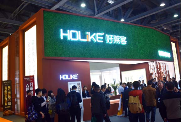 好萊客“定制家居大師”展館門頭采用大片的綠色仿真植物,展館以深咖色、白色交融,營造出環保簡約的獨特風格,突出“大師”整體企業形象、品牌實力、原態理念和品牌特有市場活力。為了滿足不同洽談需求,好萊客館內分為不同系列的產品區、不同功能洽談區、互動區等;招商負責人均由市場各區域人員擔任,面對面地為遠道而來的客商解決各種加盟疑慮和市場后顧之憂;產品區、3D展示區配備專業的培訓師為客商系統介紹產品優勢,現場提供過招銷售絕活;微信拍照區迎來不少客商駐足娛樂,在謀商機之余娛樂一把。