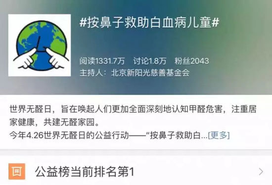 隨著明星參與,世界無醛日“按鼻子”公益在網民上迅速刮起了一股熱潮,引發全民“現象級”關注和參與。其中,“按鼻子救助白血病兒童”的微博話題榜閱讀量突破4000多萬,高居微博公益榜榜首,進入微博總榜的前十。其參與的熱度與影響力,由此可見一斑。