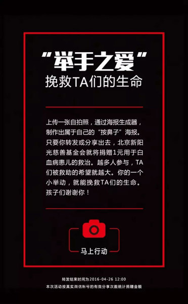 作為426世界無醛日的國內踐行者,好萊客與新陽光基金會聯合創立了新陽光-好萊客關i白血病基金,共同發起“按鼻子救助白血病兒童”公益活動,并制作了“舉手之愛”H5互動頁面,網友們只要上傳自己的按鼻子自拍照,轉發分享出去,新陽光-好萊客關i白血病基金就將捐出1元用于白血病患兒的救助。