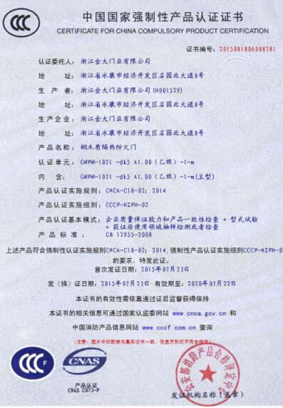 金大門業獲中國防火門產品質量CCC認證