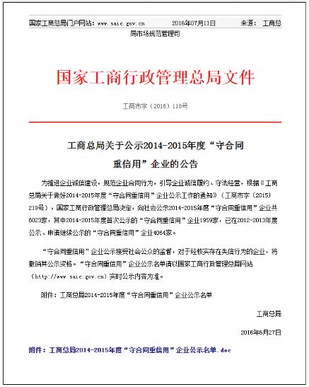 “守合同重信用”企業(yè)評(píng)選活動(dòng),是國(guó)家工商總局開(kāi)展的旨在推進(jìn)企業(yè)誠(chéng)信建設(shè),規(guī)范企業(yè)合同行為,引導(dǎo)企業(yè)誠(chéng)信履約、守法經(jīng)營(yíng)的行政指導(dǎo)活動(dòng),是社會(huì)信用體系的重要組成部分。獲評(píng)企業(yè)在守法經(jīng)營(yíng)、文明經(jīng)營(yíng)、誠(chéng)信經(jīng)營(yíng)等方面表現(xiàn)突出,有力詮釋了合同規(guī)范與商業(yè)信用在企業(yè)發(fā)展中的核心價(jià)值。該國(guó)家級(jí)評(píng)選活動(dòng)自開(kāi)展以來(lái)受到廣大企業(yè)的重視,社會(huì)認(rèn)可度高。