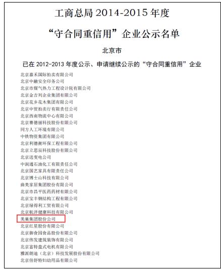 近日,國(guó)家工商行政管理總局公示了2014-2015年度“守合同重信用”企業(yè)名單,美巢集團(tuán)繼2010-2011年度、2012-2013年度之后,連續(xù)第三次獲此殊榮。