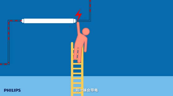 雙端LED燈管和原有被廣泛應用的熒光燈管有著類似的外形,但熒光燈管內充有惰性氣體,其一端插入燈座,另一端懸空時,懸空段燈頭不會帶電。而目前市場上的部分雙端LED燈管一頭插入帶電的燈座后,另一頭懸空時會通過內部電路帶電。普通消費者在安裝使用時如果沒有辨別清楚是否已經切斷電源,安裝時雙端LED燈管一頭插入燈座,另一端就會對消費造成觸電和隨之而來的跌落雙重安全隱患。由于具體安全標準的滯后,一些知名企業推出了能夠有效避免此類觸電危險的單端燈管,而由于單端概念沒有完全的普及,現在市場上出現了雙端和單端兩種結構并存的情況。