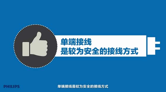對于目前雙端LED燈管市場的安全現狀,以飛利浦為代表的知名企業始終遵照國際標準生產,并積極的呼吁國內安全標準出臺,但也無奈難以從根本上解決雙端市場的困局。多家照明企業已有表示,按照IEC標準,LED燈管安全的接線方式是單端進線。對于廣大消費者最為關心的單端LED燈管的安裝,飛利浦照明售后工程師表示,其實安裝單端進線方式的LED燈管并沒有想象中那么復雜。如果是新裝修安裝的話,直接插入安裝就可以。如果是替換原有的熒光燈管,可以選擇重新布線,對于有資質的電工來說,布線也是一件很簡單的事。