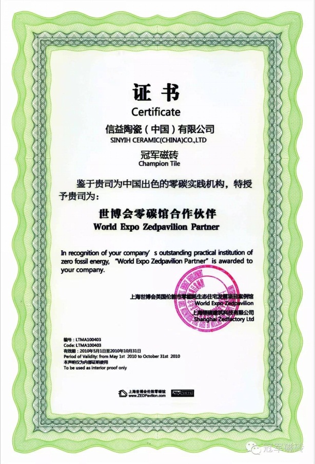 2010年,獲得“世博會零碳館合作伙伴”及“世博會零碳館指定用磚”。