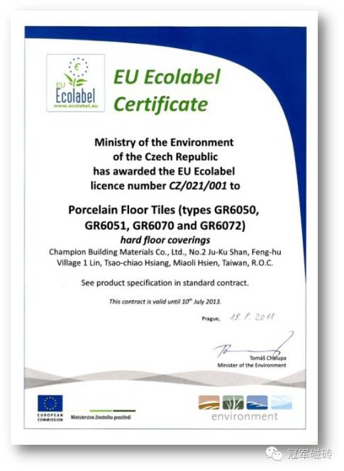 2013年,冠軍磁磚臺灣產品正式向歐盟認證發起挑戰,憑藉精湛工藝和精挑嚴選的材料,以及業內唯一設立『綠色工廠』,面對環保認證層層關卡,冠軍磁磚無不一一突破。冠軍磁磚是首家申請通過歐盟環保認證的陶企。一個個閃亮的綠色認證勛章,見證著冠軍磁磚對綠色環保的執著和堅持。