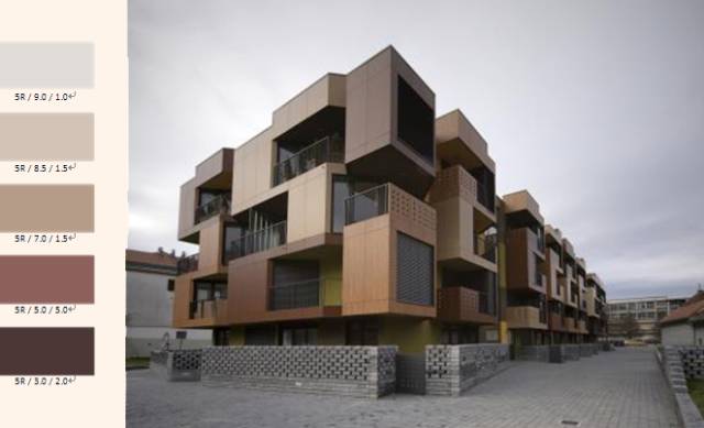 建筑外墻如果大面積選用淺色,建議選明度在60-65之間的數值更耐臟;純度低于300以下數值的顏色特別適合建筑外墻大面積使用,不會造成視覺上的不舒適,還能經久耐用不易褪色。