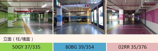 地下車庫的行車區域地面顏色選擇根據安全性要考慮標記線或符號與底色的明度差,建議選擇明度小于55的數值的顏色;柱/墻面有識別和引流的功能,要選擇誘目性較高的顏色,建議選擇純度在250以上,明度在50以下數值的顏色。