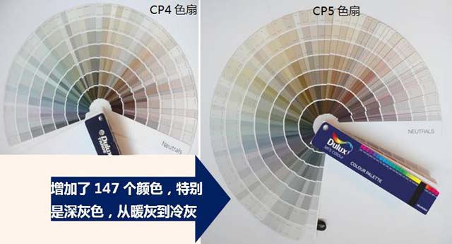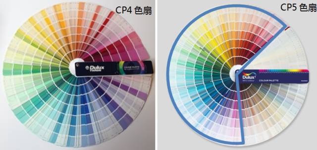 CP5色扇擁有2079種顏色;其中包括并保留1231 種CP4 中最暢銷的顏色。增加了黃綠和藍綠兩個色相,使得色相全面覆蓋。增加了更多深艷色、中性色和白色區域的顏色;明度、純度在排布中過渡均勻變化自然。特別增加了一些適合建筑立面選用的深色,即柔和過度了色階,又符合現在流行和商業用的色彩趨勢。