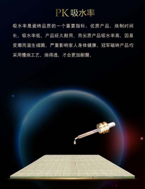 日常生活中,我們常常會(huì)發(fā)生一些小意外,類似于將墨汁倒在地上,或者小朋友在地上的隨意涂鴉,如果木紋磚的吸水率低,顏色滲入瓷磚紋理,不僅美觀大打折扣,而且這樣的瓷磚不耐磨,易吸污,長(zhǎng)久使用后會(huì)散發(fā)異味,滋生細(xì)菌,影響生活品質(zhì)。冠軍森林浴系列采用慢燒工藝,采用世界一流生產(chǎn)設(shè)備,其中95%設(shè)備為意大利進(jìn)口,無論是7500噸高壓成型機(jī)還是精密高溫電腦控溫窯爐,百分之百確保冠軍的產(chǎn)品達(dá)到無可挑剔的世界級(jí)標(biāo)準(zhǔn)。燒制時(shí)間長(zhǎng),致密度高,因此更耐磨、吸水率更低。在檢測(cè)中,將藍(lán)墨水滴到冠軍森林浴產(chǎn)品與某品牌木紋磚上,在相同時(shí)間內(nèi),冠軍森林浴幾乎不吸水,而某品牌木紋磚上的藍(lán)墨水基本都浸漬到了產(chǎn)品內(nèi)部,孰好孰壞,一目了然。