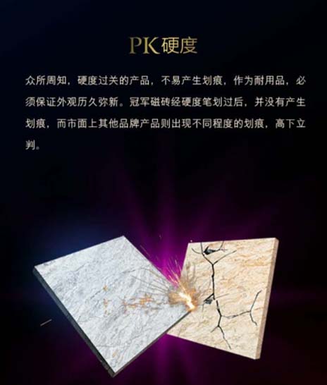 世界一流的生產(chǎn)設(shè)備及先進(jìn)的生產(chǎn)工藝,不僅使冠軍森林浴具備低吸水率,也具備了高硬度。硬度是瓷磚質(zhì)量的一個(gè)重要因素。優(yōu)質(zhì)的瓷磚一般硬度較高,韌性強(qiáng),不易破碎,鋪貼經(jīng)歷較長(zhǎng)時(shí)間都不會(huì)發(fā)生龜裂和變形。最簡(jiǎn)易的方法是拿莫氏硬度筆刮劃兩款產(chǎn)品,在檢測(cè)中,使用9級(jí)莫氏硬度筆分別劃過冠軍森林浴與某品牌木紋磚后,可以發(fā)現(xiàn)某品牌木紋磚上劃痕明顯,硬度明顯低于森林浴系列產(chǎn)品,眼見為實(shí),高低立見。