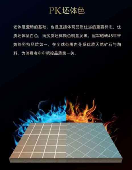 除了從生產(chǎn)設(shè)備、工藝上遙遙領(lǐng)先某品牌外,生產(chǎn)冠軍森林浴的優(yōu)質(zhì)原料也是某品牌無法比擬的。優(yōu)質(zhì)原材是打造高品質(zhì)瓷磚的基礎(chǔ)與第一道關(guān)卡,冠軍磁磚為了保證瓷磚品質(zhì),在全球范圍尋覓最優(yōu)異的天然礦石與意大利進(jìn)口釉料,甚至耗資重金自購(gòu)天然礦山。森林浴系列由天然氣燒制而成,質(zhì)地純正、坯體無雜質(zhì),呈白色,在優(yōu)質(zhì)原材與天然氣的雙重護(hù)航下,冠軍磁磚將高強(qiáng)度、高穩(wěn)定性以及良好的產(chǎn)品感官等卓越性能融為一體,盡情演繹產(chǎn)品的本色魅力。而某品牌為節(jié)約成本,原料較為劣質(zhì),用煤炭這種低成本能源作為主要燃料生產(chǎn)出來木紋磚,坯體黑暗,好壞一看便知。