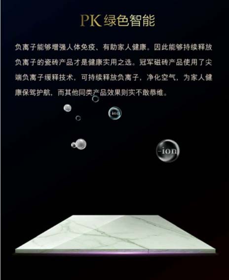 冠軍森林浴系列還具備一個(gè)其他木紋磚品牌不具備的功能:負(fù)離子功能。把冠軍森林浴系列放入負(fù)離子檢測(cè)箱中,發(fā)現(xiàn)檢測(cè)箱中的負(fù)離子濃度相當(dāng)于鄉(xiāng)間田野的空氣質(zhì)量,某品牌放入后負(fù)離子檢測(cè)器無反應(yīng)。冠軍森林浴應(yīng)用“負(fù)離子專利技術(shù)”,永久性釋放負(fù)離子,能有效改善凈化室內(nèi)環(huán)境,消除甲醛、TVOC、苯及苯系物、氨等室內(nèi)污染物的危害,負(fù)離子還具有增強(qiáng)人體免疫力、減少疾病傳染,有效改善失眠、哮喘、緩解高血壓等頑疾,尤其家里有老人和小孩的家庭。冠軍負(fù)離子系列產(chǎn)品讓消費(fèi)者身在家中、足不出戶,就能享受到大自然帶來的健康清新氣息。