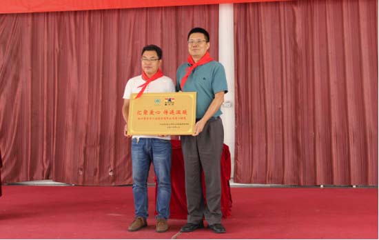 霍爾茨木門總經理趙崇聯與平山縣溫塘希望學校校長李軍為捐助儀式揭牌