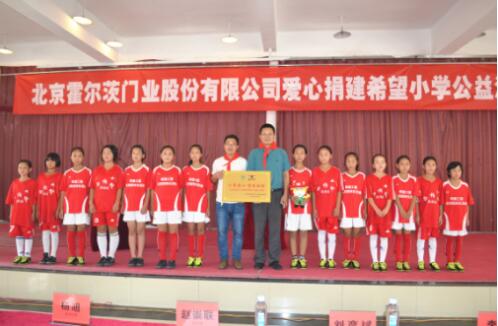 2016年9月24日,一場獨特的公益活動悄然舉行——由木門行業領導品牌霍爾茨木門舉辦的愛+生態公益行,在河北平山縣溫塘希望學校召開。 霍爾茨木門總經理趙崇聯、副總經理楊旭等企業高層領導皆驅車400公里前往溫塘希望學校出席活動。此次愛心公益行,為溫塘希望學校換上量身設計的霍爾茨T型木門,為學校的孩子們打造出了一片安全、健康的學習環境。