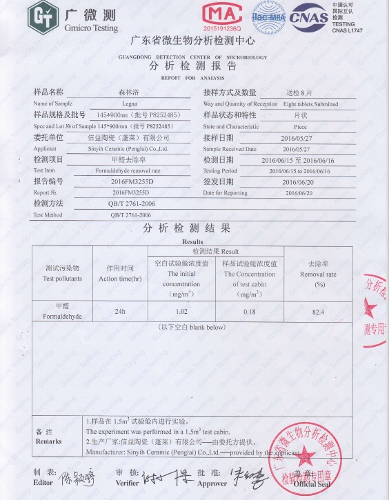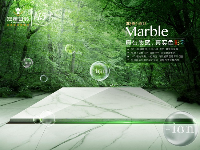 冠軍磁磚瓷磚系列中,3D真石及森林浴產(chǎn)品采用“負(fù)離子專利技術(shù)”,可永久持續(xù)釋放負(fù)離子,經(jīng)國(guó)家專業(yè)檢測(cè)機(jī)構(gòu)檢測(cè),空間負(fù)離子釋放量可達(dá)到3000±500個(gè)/cm2,人們長(zhǎng)時(shí)間生活在這樣的環(huán)境中,有益于生命與健康。