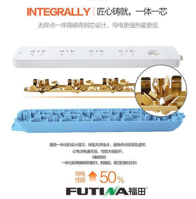 排插接線板內部結構千萬不能忽略,家長一定要選擇銅件一體化的。原因何在?由于市面上的71%的排插產品內部結構:銅線+銅片,這種構造容易造成短路以及散熱性能差,同時用戶使用過程中,焊點處焊接不好溫度上升快,如果有接觸不良,那就更容易產生電火花和短路隱患,從而導致火災的發(fā)生。而福田安全插座一體化的銅件的優(yōu)點是避免虛焊、接觸不良,同時導電性強、發(fā)熱量低,杜絕安全隱患。