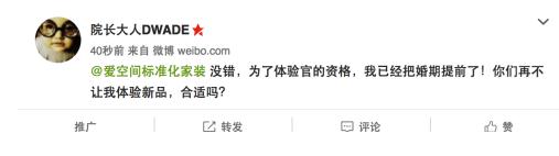 網友提到的體驗官資格是愛空間聯合新浪等權威媒體,于4月中旬在全國范圍發起的“挑戰愛空間”召集活動,活動不僅提供百萬裝修體驗金,還能讓消費者與20位媒體大佬們近距離吐槽家裝感受,體驗標準化家裝。有了百萬紅包和權威媒體背書及監督,迅速在消費者中掀起報名熱潮,由于抽中的體驗官需滿足在6月31日前開工首批體驗愛空間標準化家裝新品,這才有了網友要提前結婚湊裝修的事件!