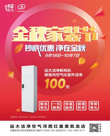 引導語:作為國內新風領域的領導者,為了感恩回饋客戶們長達十年之久的信賴與選擇,遠大新風將于9 月 18 日至10 月 7 日在全國范圍內線上線下同步進行以“抄底優惠 凈在金秋——遠大新風 使室內空氣比室外潔凈 100 倍”為主題的優惠活動。該活動的舉行,將會給客戶們帶來更多的優惠和福利。