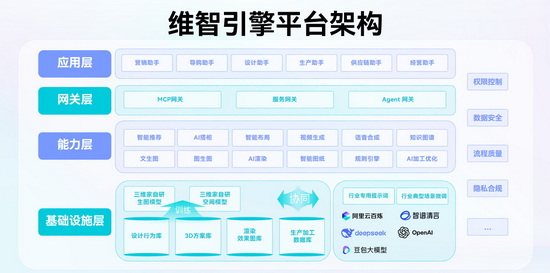 三維家AI產品專家周子超在大會壓軸環節,正式揭幕了面向家居行業垂直領域打造的智能體開發平臺——維擎引擎(V-Engine),其架構基礎層融合了DeepSeek、OpenAI、阿里云等外部通用大模型與三維家自研的專用模型,解決了行業專業性問題,能力層集成了生圖、文案、搭柜、布局、視頻等多種AI能力模塊。并通過智能網關整合,形成一個強大的平臺。應用層支持通過可視化拖拽的方式,便捷地搭建覆蓋營銷、設計、生產全鏈路的“AI數字員工”,幫助企業解決人才困境并支撐高客單價轉型。